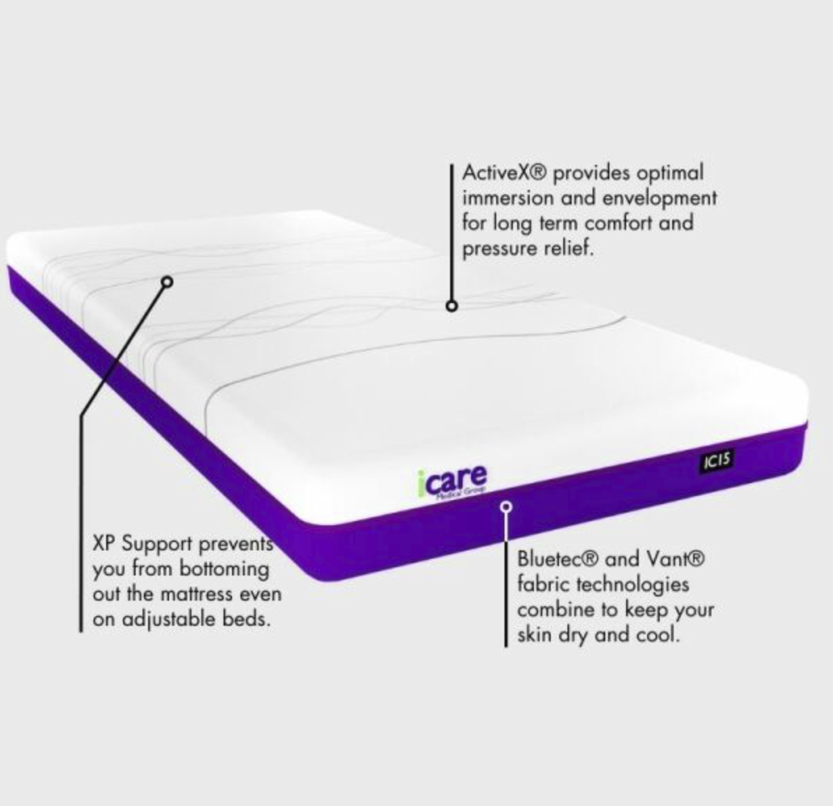 The IC15 firm mattress offers support and comfort. Firm feel makes it easier for turning. Pair with an Icare Beds or suitable on any base platform.